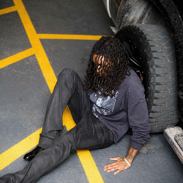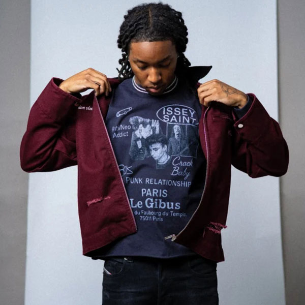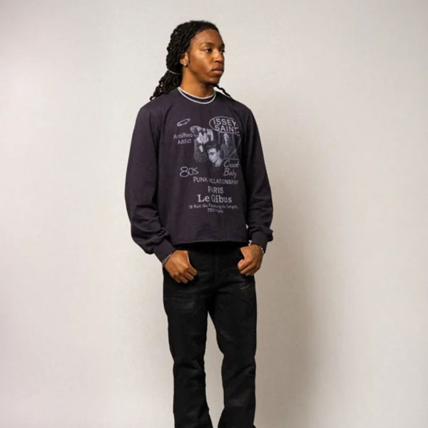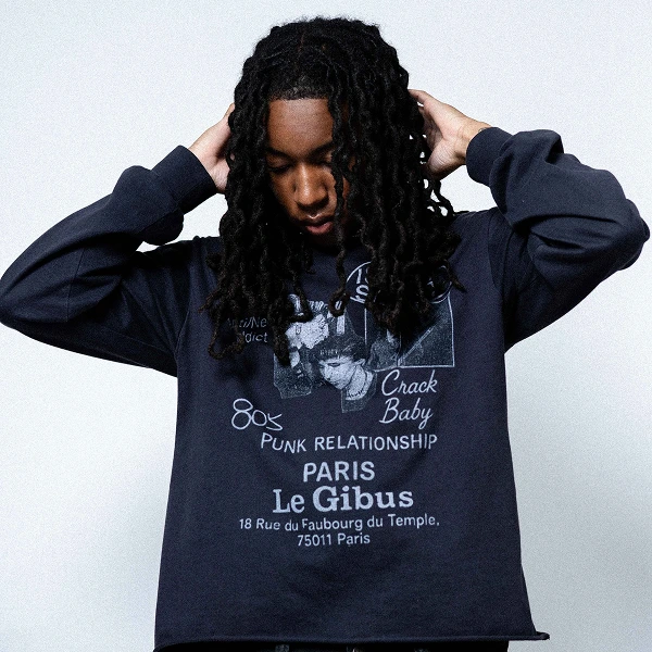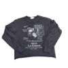 A relaxed-fit, drop-shoulder crewneck in 100% cotton, pre-washed for a vintage finish. Features a full front graphic print, ribbed neckline and cuffs, and a slightly curved raw-edge hem. Color: washed vintage black